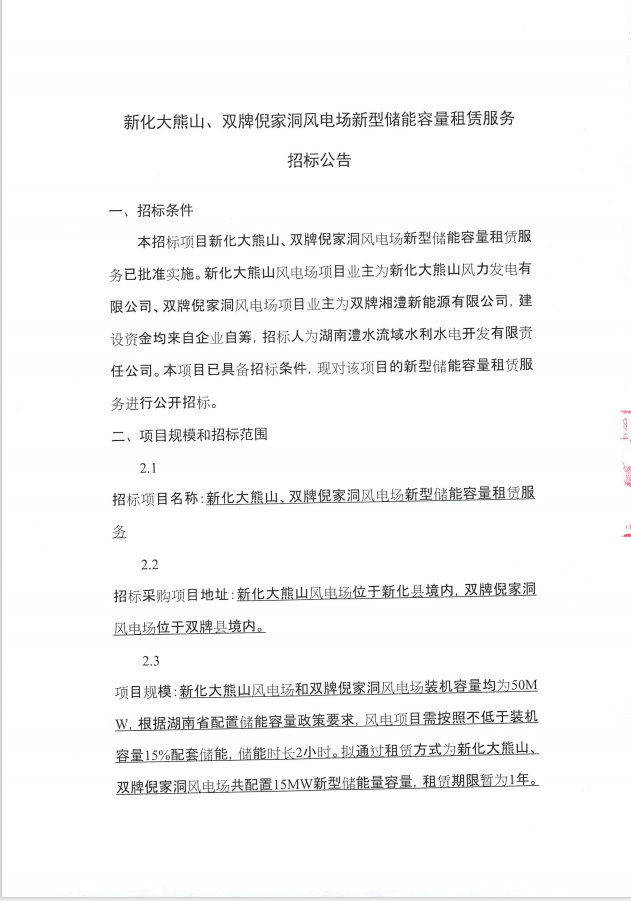 新化大熊山、雙牌倪家洞風(fēng)電場新型儲能容量配置租賃服務(wù)招標公告 來源:企管部 發(fā)布時間:2024-01-26 瀏覽數(shù): 次 【字體:小 大】 (本公告僅用于司務(wù)公開,以招標公告指定發(fā)布平臺為準) 【打印正文】 分享到: